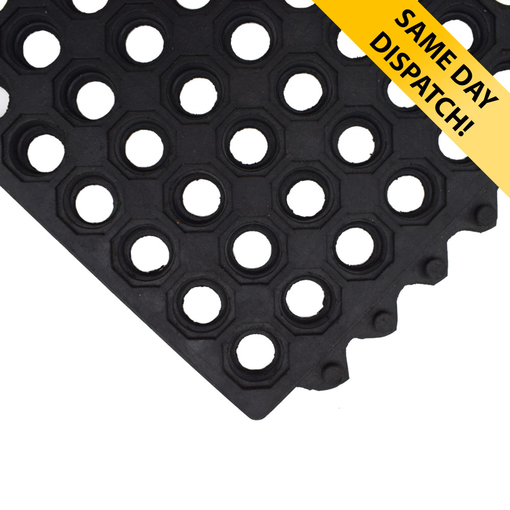 This matting is supplied in 0.91m x 0.91m tiles which provide a fast and simple installation option, thanks to the secure locking system. Each individual tile uses an integrally moulded studded edge, which enables the rubber mats to be connected together with ease.