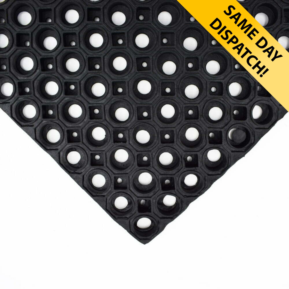 This particular matting is ideal for use in high footfall and constant use applications due to its durable construction. The open ring design of the matting enables it to quickly drain any liquid and debris away from the surface. It also enables the matting to compress and flex under pressure. This serves to absorb impact and reduce potential injuries from trips and falls. It also provides our matting with anti-fatigue properties and superior underfoot comfort.