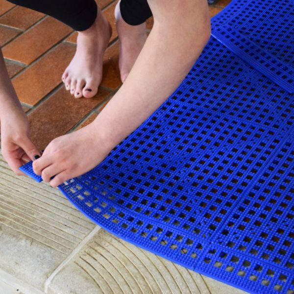 The top layer of the Flexi-Deck tiles contains hundreds of small studs. These serve to increase the anti-slip properties of tile without compromising on barefoot comfort. The studs also help to drain liquid and debris away from the surface of the tiles.